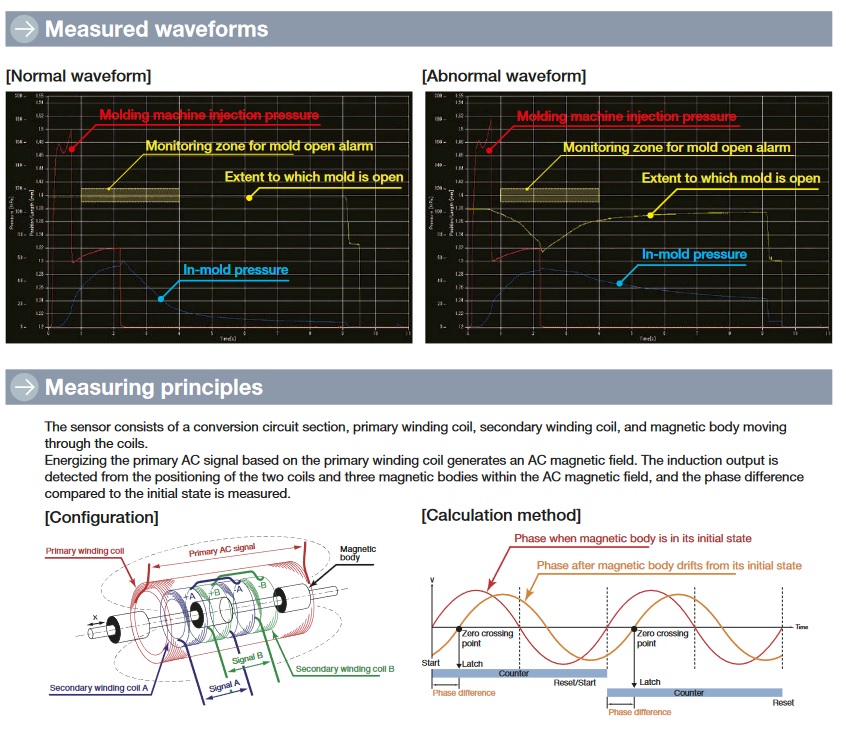 By attaching our position sensor to the mold, the totalRequired mold tightening force obtained from the calculated value (projected area x cavityBy quantifying the change point where burrs occur with respect to the internal pressure)Wear.In other words, it has a positive effect on the mold and is also good for venting gas.It becomes possible to derive a convenient and appropriate mold clamping force.It is often said that the mold breathes, but in the relevant partBy arranging MEL, gold due to injection pressureThe amount of deflection inside the mold can be quantified, and the estimated value and actual value at the time of designYou can compare the measured values.Also, make a new moldWhen placing it on a mold and making a trial shot, a digital device is attached to the outside of the mold.There is work to attach the cage and watch the movement of the mold, but this is the caseBy installing the company's sensor, it has a display function at handYou can easily check the numerical value with the converter.